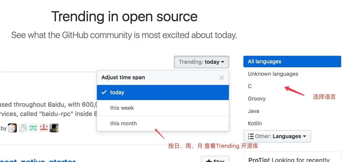 Github 上有海量的开源库,我们怎么才能找到好的、有意思的开源库呢?我们可以看一看Github 的 Trending排行榜,上榜的都是一些当前流行的库,分为日、周、月 的Trending 排行榜。