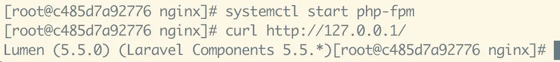 可以正常打印出:Lumen (5.5.0) (Laravel Components 5.5.*),表示我们的 nginx 和 php-fpm 启动并配置成功了。