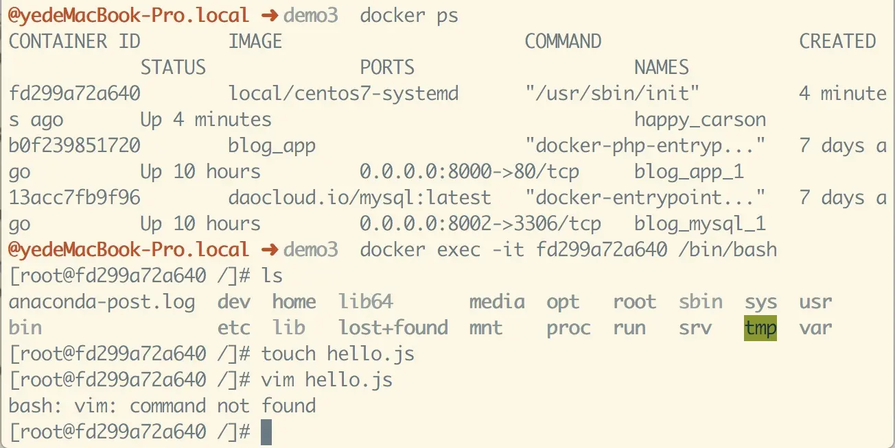 当我们运行 vim 想打开编辑某个文件时,发现 vim 并没有安装,这时候我们可以直接在容器中安装,但为了模拟的更彻底,我们再修改修改 Dockerfile 文件,让镜像带上 vim: