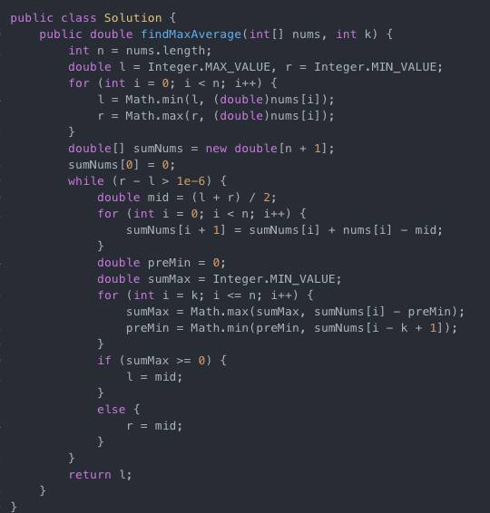 这道题是一道medium偏难题,难点在于如何把关于最大平均值的判断问题转化成关于最大和的判断,从而用二分答案的方法解决,这实际上是所有二分答案方法的特点。