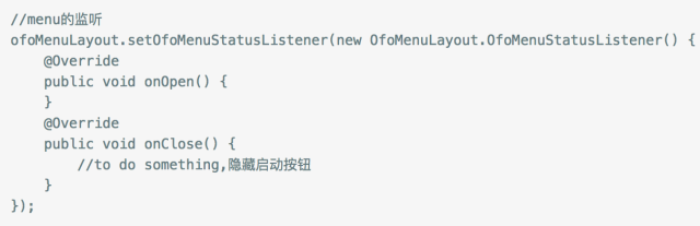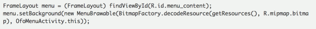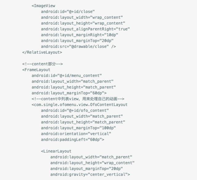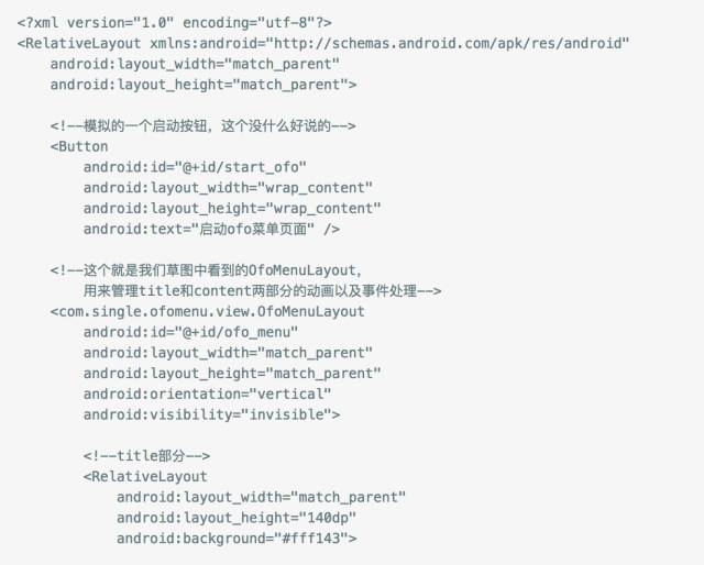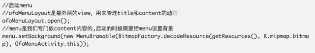 上面的title部分就没什么好说的了,就是一个相对布局,右上角放了一个关闭按钮,咱们主要是看下Content部分,静态感受下 Content的背景是如何生成的,可以见OfoMenuActivity设置了这么一句代码: