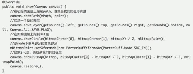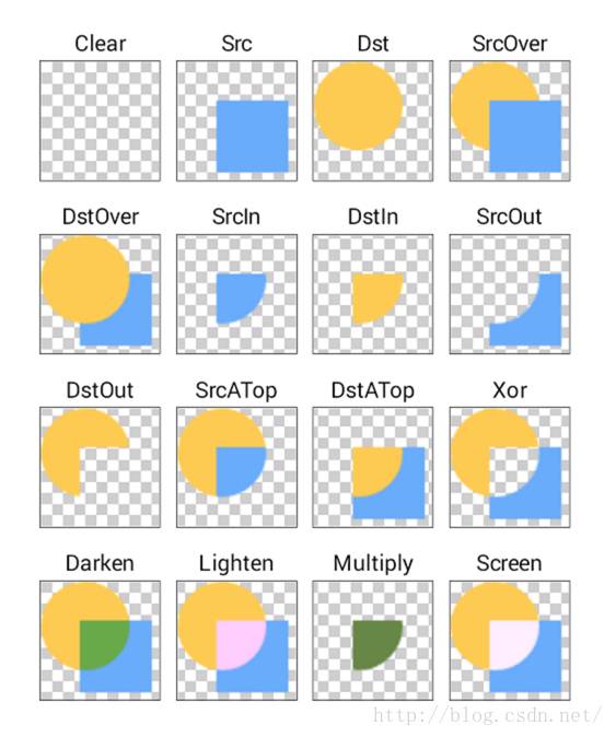 在绘制的时候用到了paint.setXfermode(new PorterDuffXfermode(PorterDuff.Mode.SRC_IN)),关于PorterDuffXfermode传的mode网上有对应的图: