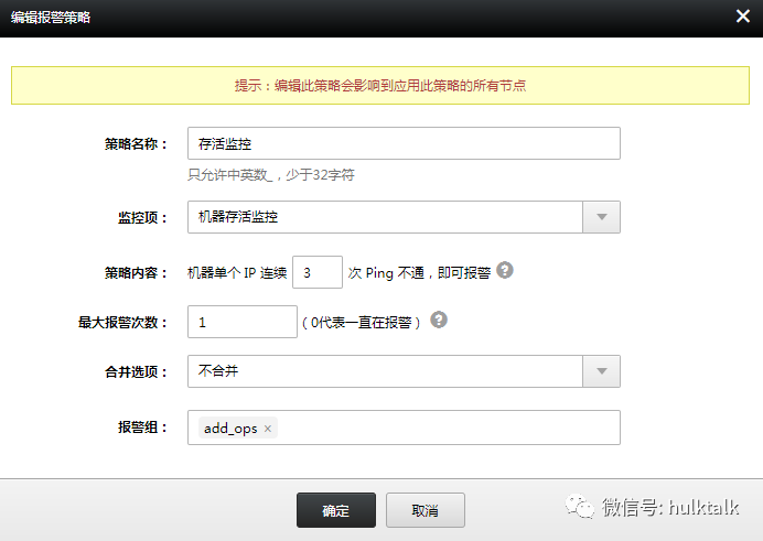 存活监控作为一种特殊的基础监控已经内置,用户只需配置策略即可报警。