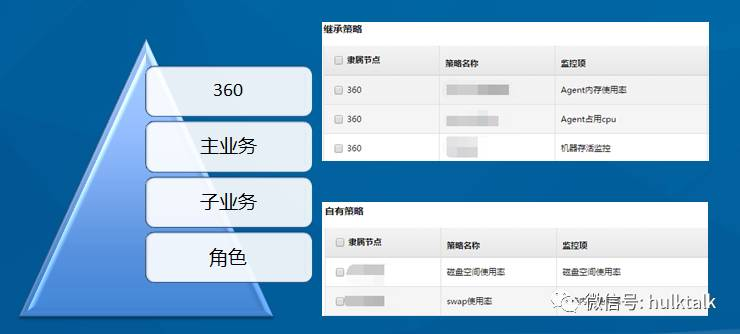 结合CMDB沿用的私有云的业务树层级关系,从最初的360 节点-主业务-子业务-角色,策略、自定义监控和日志监控都是继承关系,并且支持下级自由关闭继承策略和添加自有策略等操作。用户权限:和hulk强一致