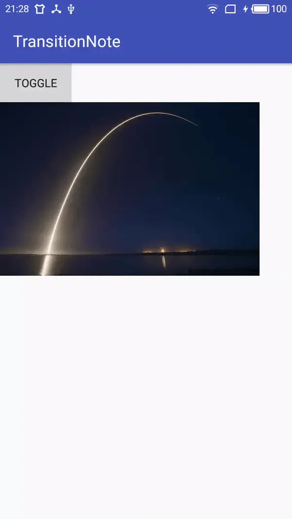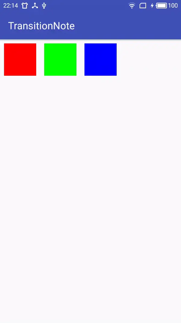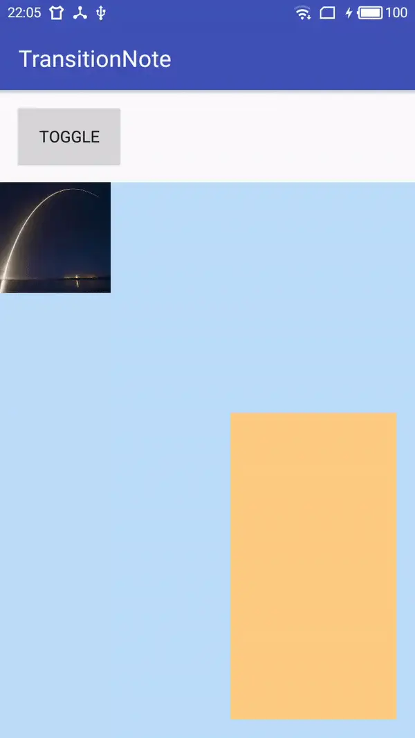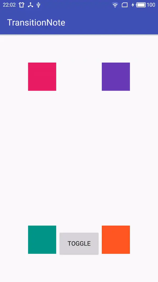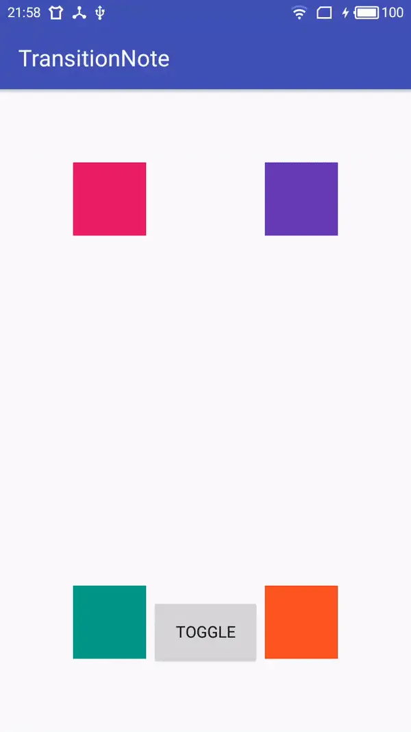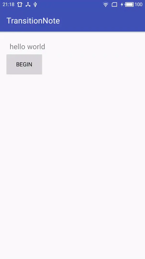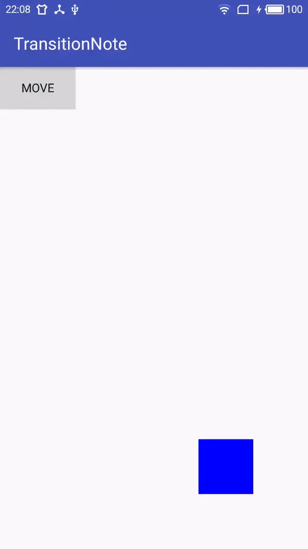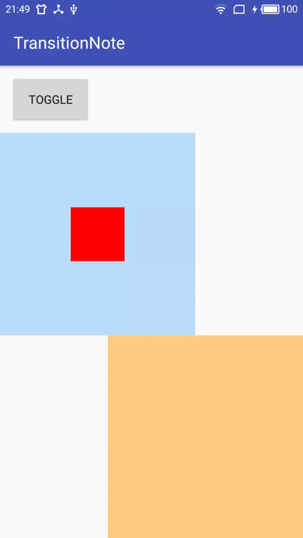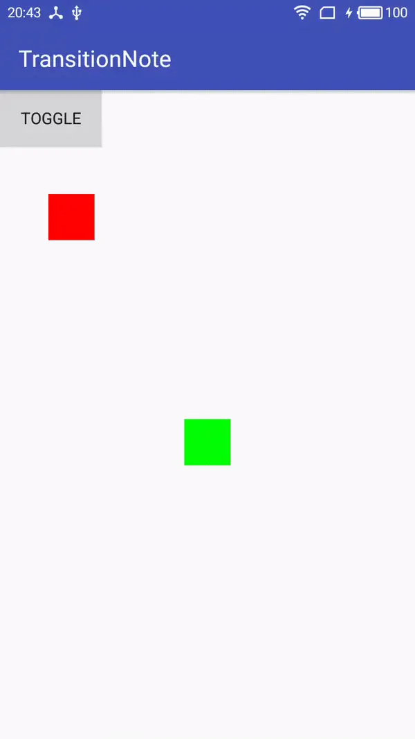 TransitionManeger用于将Scene和Transition联系起来,它提供了一系列的方法如setTransition(Scene fromScene, Scene toScene, Transition transition)指明起始场景和结束场景、他们的过渡动画是什么,go(Scene scene, Transition transition),到指定的场景所使用的过渡动画是什么,beginDelayedTransition(ViewGroup sceneRoot, Transition transition),在当前场景到下一帧的过渡效果是什么。比如这里使用go()方法,效果: