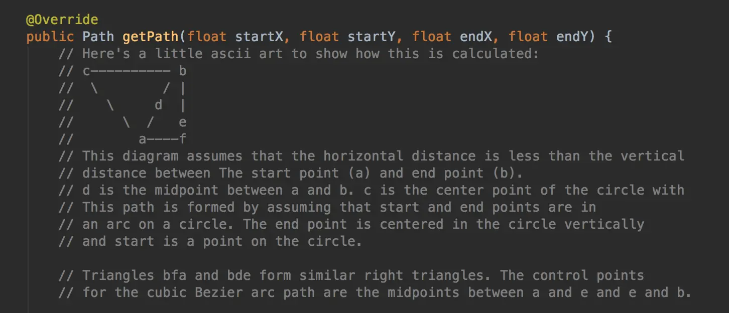 它的运动轨迹是条曲线,有兴趣的可以研究下它的实现算法,在源码中有个很萌的图如下: