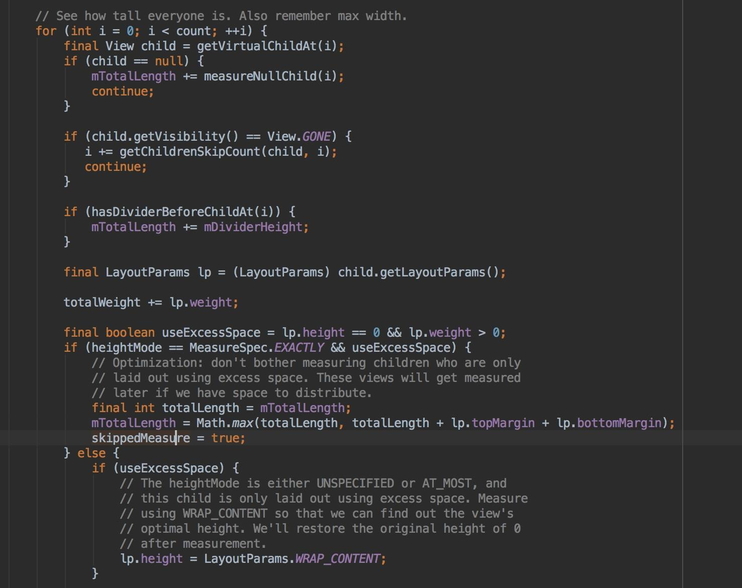 再来看看LinearLayout的onMeasure方法。以measureVertical为例,父视图在对子视图进行measure操作的过程中,使用变量mTotalLength保存已经measure过的child所占用的高度,该变量刚开始时是0。在for循环中调用measureChildBeforeLayout()对每一个child进行测量,该函数实际上仅仅是调用了measureChildWithMargins(),在调用该方法时,使用了两个参数。其中一个是heightMeasureSpec,该参数为LinearLayout本身的measureSpec;另一个参数就是mTotalLength,代表该LinearLayout已经被其子视图所占用的高度。 每次for循环对child测量完毕后,调用child.getMeasuredHeight()获取该子视图最终的高度,并将这个高度添加到mTotalLength中。在本步骤中,暂时避开了lp.weight>0的子视图,即暂时先不测量这些子视图,因为后面将把父视图剩余的高度按照weight值的大小平均分配给相应的子视图。源码中使用了一个局部变量totalWeight累计所有子视图的weight值。处理lp.weight>0的情况需要注意,如果变量heightMode是EXACTLY,那么,当其他子视图占满父视图的高度后,weight>0的子视图可能分配不到布局空间,从而不被显示,只有当heightMode是AT_MOST或者UNSPECIFIED时,weight>0的视图才能优先获得布局高度。最后我们的结论是:如果不使用weight属性,LinearLayout会在当前方向上进行一次measure的过程,如果使用weight属性,LinearLayout会避开设置过weight属性的view做第一次measure,完了再对设置过weight属性的view做第二次measure。由此可见,weight属性对性能是有影响的。