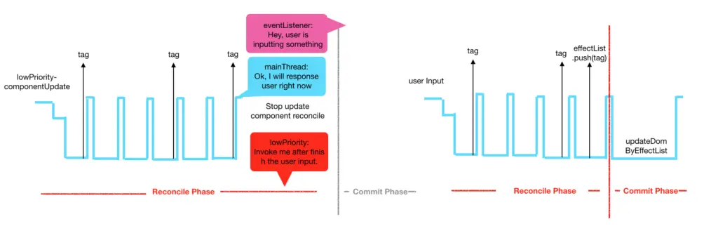 我们点击按钮之后,unstable_deferredUpdates将这个更新任务设置为low priority。此时是没有其他任务存在的,React就开始进行状态更新了。更新任务进入了Reconcile阶段,我们点击输入框,此时,用户交互任务来了,此任务优先级高于更新任务,所以浏览器主线程将焦点放在了输入框……。之后更新任务进入了Commit阶段,不能将浏览器主线程放弃,到了最后浏览器渲染完成之后,将用户在更新任务Commit阶段的输入以及最新的状态显示出来。