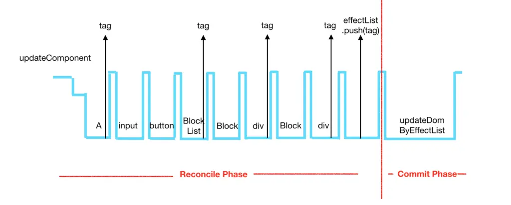- Reconcile阶段。此阶段中,依序遍历组件,通过diff 算法,判断组件是否需要更新,给需要更新的组件加上tag。遍历完之后,将所有带有tag的组件加到一个数组中。这个阶段的任务可以被打断。