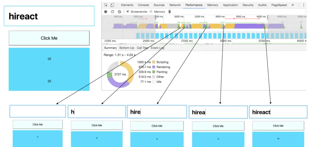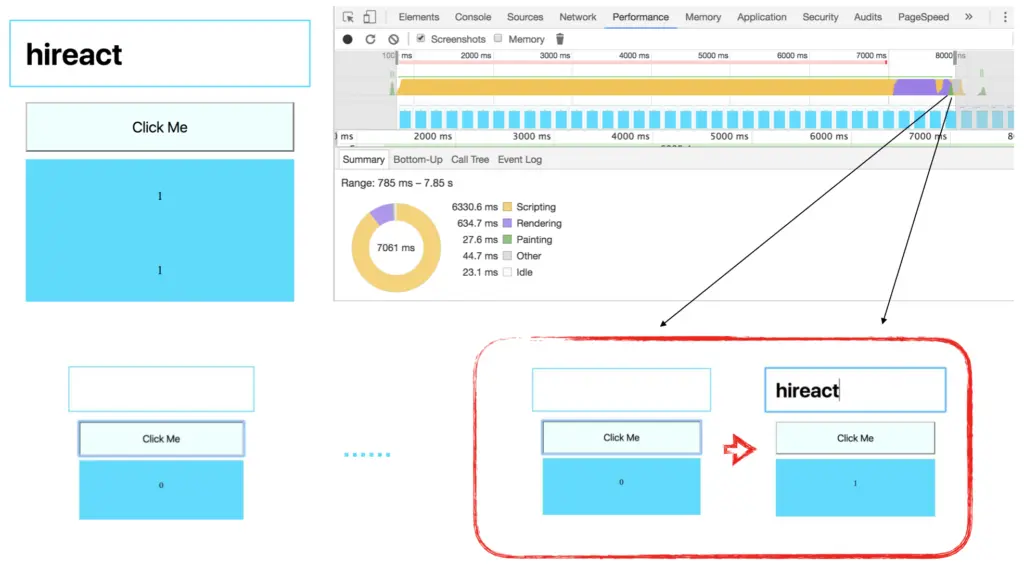 可以看到,在黄色JavaScript执行过程中,也就是React占用浏览器主线程期间,浏览器在也在重新计算DOM Tree,并且进行重绘,截图显示,浏览器渲染的就是用户新输入的内容。简单说,在React占用浏览器主线程期间,浏览器也在与用户交互。这个才是我们在网站上面期望获得的体验,浏览器总是对我的输入有反馈。