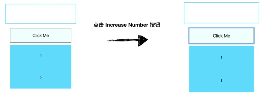 首次渲染出页面之后,我们点击按钮,页面中的数字显示框的值由0变为1。如下图所示: