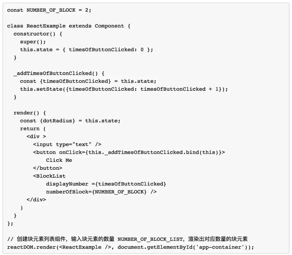 这个例子会在页面中创建一个输入框、一个按钮、一个BlockList组件。BlockList组件会根据NUMBER_OF_BLOCK的数值渲染出对应数量的数字显示框,数字显示框显示点击按钮的次数。我们最开始设置据NUMBER_OF_BLOCK为2 ,只渲染2个数字显示框。