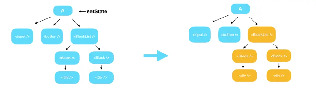 当点击按钮的时候,按钮点击次数从0变为1,我们需要告诉React下面要显示1了,于是,通过setState操作,我们告诉React: 下一个你需要显示的数据是1。然后,React 开始更新组件。对应的Virtual DOM Tree变化如下图所示。黄色表示状态被更新。