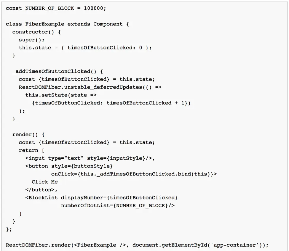 我们重写一个组件,跟之前的一样。一个输入框,一个按钮,一个BlockList组件。BlockList组件会根据NUMBER_OF_BLOCK的数值渲染出对应数量的数字显示框,数字显示框显示点击按钮的次数。将NUMBER_OF_BLOCK设置为100000,模拟一个复杂的页面。不同的是,使用Fiber reconcile调度策略,设置任务优先级,让浏览器先响应用户输入再执行组件更新。