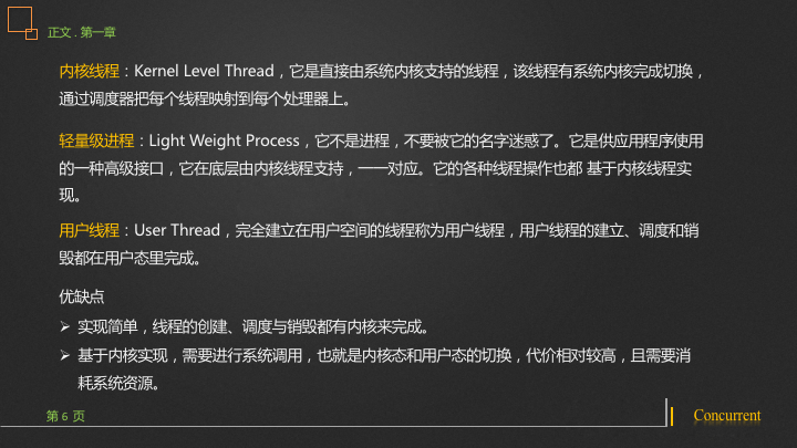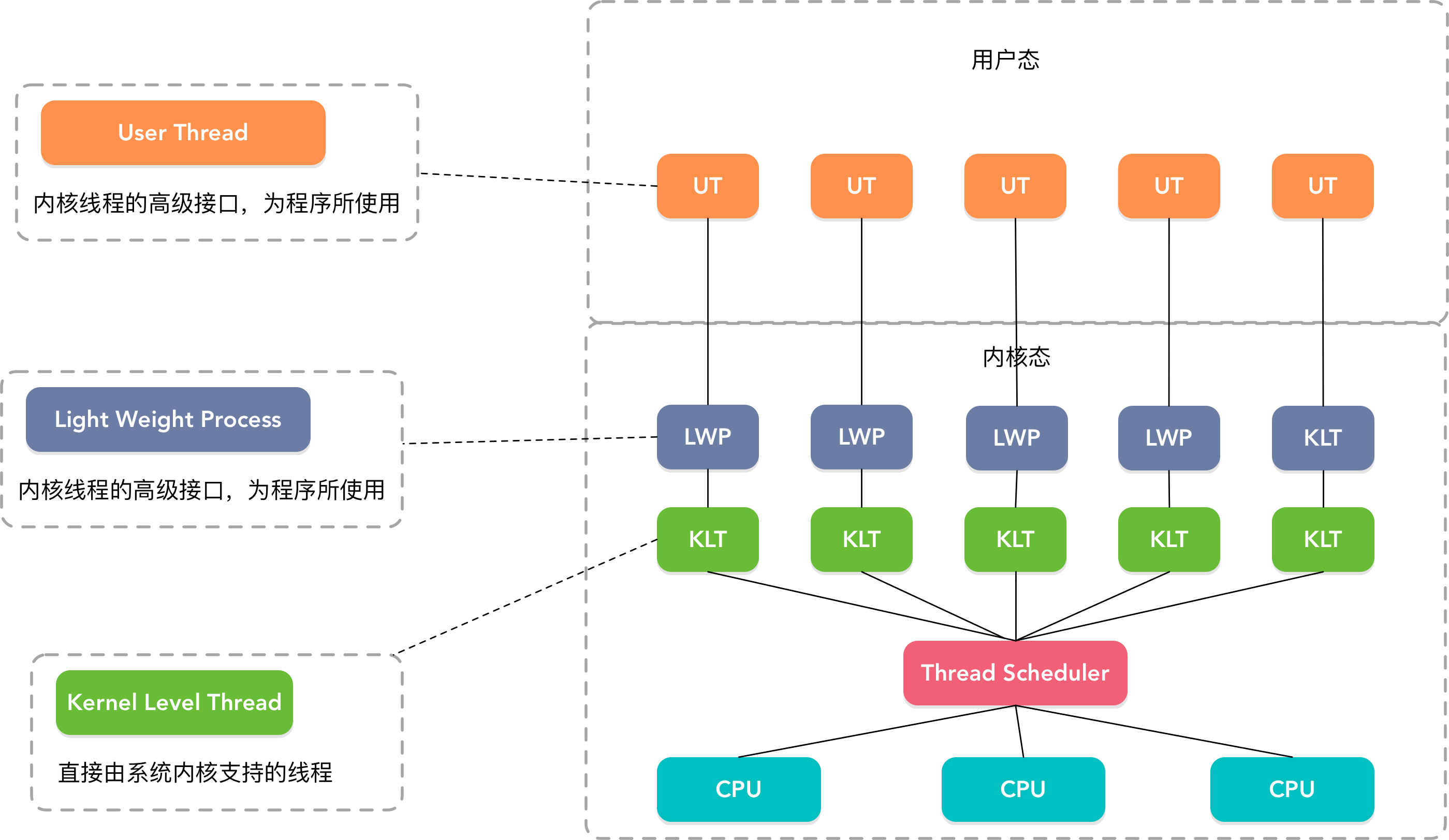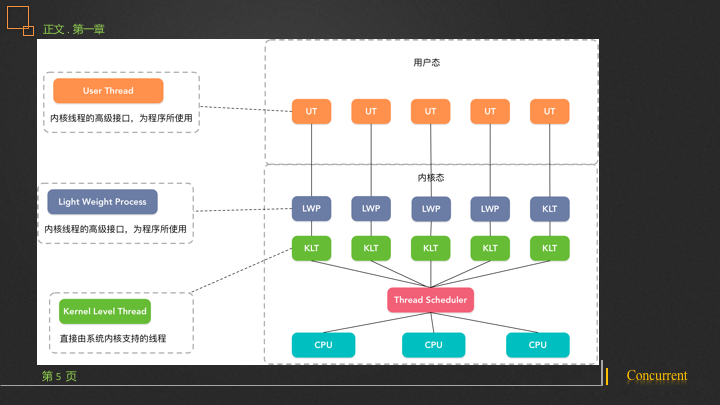 内核线程:Kernel Level Thread,它是直接由系统内核支持的线程,该线程有系统内核完成切换,通过调度器把每个线程映射到每个处理器上。