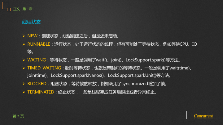 - WAITING:等待状态,一般是调用了wait()、join()、LockSupport.spark()等方法。