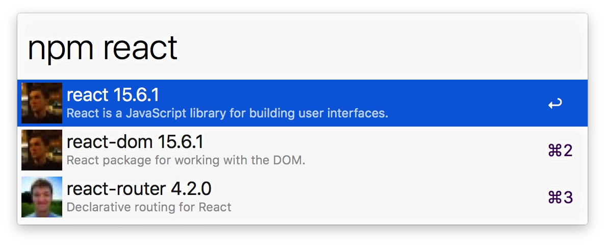 在 Alfred 中, 输入 npm, Space , package 为你想要查找的模块. (例如: npm lodash)