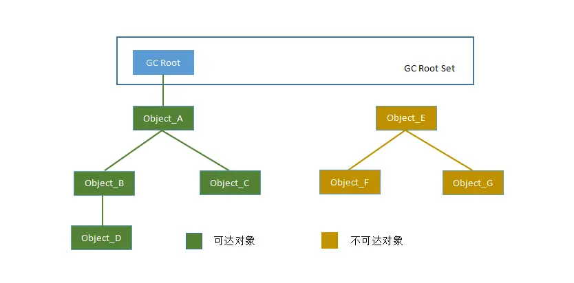 这种方式可以将所有对象的引用关系想象成一棵树,从树的根节点GC Root遍历所有引用的对象,树的节点就为可达对象,其他没有处于节点的对象则为不可达对象。