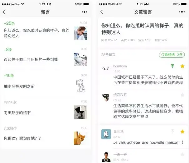 开通了留言功能的公众号,可查看每篇文章的留言,并进行精选、置顶和回复等操作。