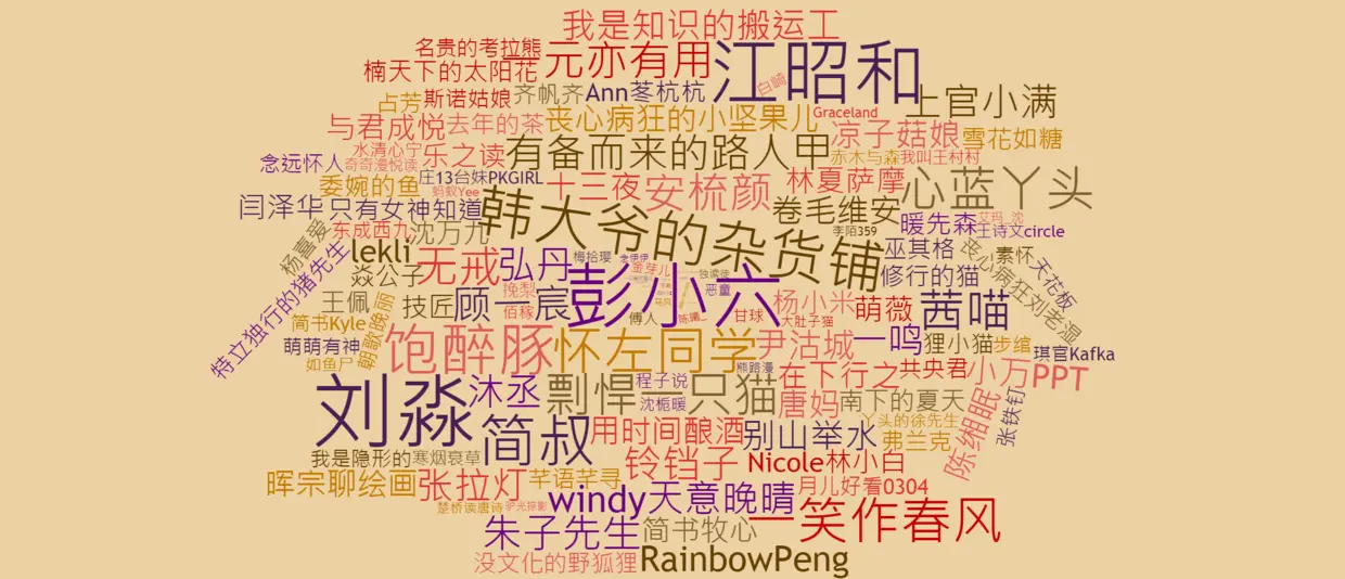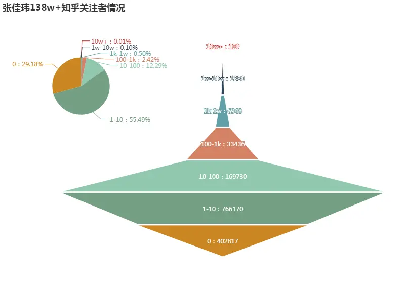 绘制成金字塔图后可知,这26w+用户里:粉丝数大于10w+的有5人,依次为:@刘淼、@简黛玉、@彭小六、@简书播客、@江昭和,均是万中挑一的人物;其他各梯度人数看图即可,不再赘述。值得一提的是粉丝数10-100区间的人数占比最大,为40.38%,而非0粉或1粉的用户,这进一步说明了本次本次爬取的数据较为优质。与《爬取张佳玮138w+知乎关注者:数据可视化》一文中张佳玮138w+知乎关注者中0粉占比29.18%,1-10粉占比55.49%,两者相加用户数已超过116w+,两相对比,更能说明上述问题: