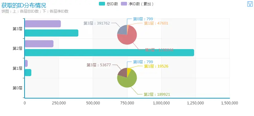 爬取799个种子ID(记为第0层,图中由于数量级偏小,所以看不到出来柱形图的图案)各自的关注者,得到第1层47601条总ID数据(含重复ID),新增19526个净ID;再根据第1层新增的净ID,爬取其关注者,得到第2层1239366(约124w+)条总ID数据,新增189921个净ID;再根据第2层新增的净ID,爬取了部分ID的关注者,得到第3层391762条总ID数据,新增53677个净ID。