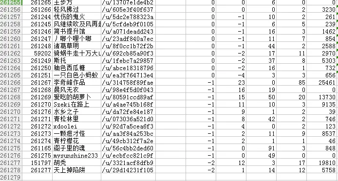 另外这26w+用户里0粉的有784人,论理本次爬取时能被爬取到的都起码有一个粉丝,要不然不符合上述爬取的思路,但这里却发现不仅有0粉的,甚至有十来个用户粉丝数为负数,不知道是不是简书的BUG,去他们的主页查看,发现确实显示的是负数,但是又明明有粉丝???