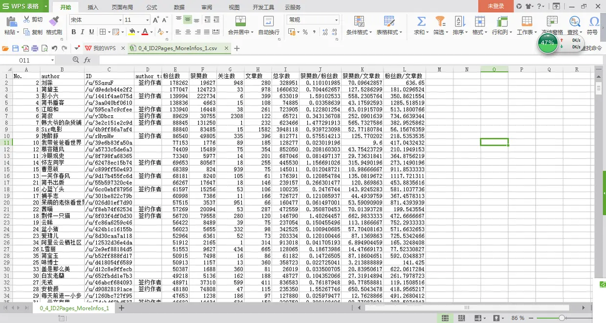 在通过2-3层数据爬取后,共获得261277条用户信息,具体数据有:用户名、主页url、是否为签约作者、粉丝数、获赞数、关注数、文章数、总字数等等: