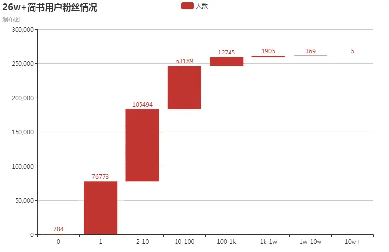 知道了各个梯度(区间)用户的数量和占比,自然也就能知道每个人的大致排名。以我自身为例,粉丝数480人,排名4140,为前1.6%。还有很大的努力空间。再将所有用户粉丝分布情况绘制成瀑布图,更能给所有奋笔疾书、努力写作和输出的人不断涨粉后跃迁、上升的直观感觉。