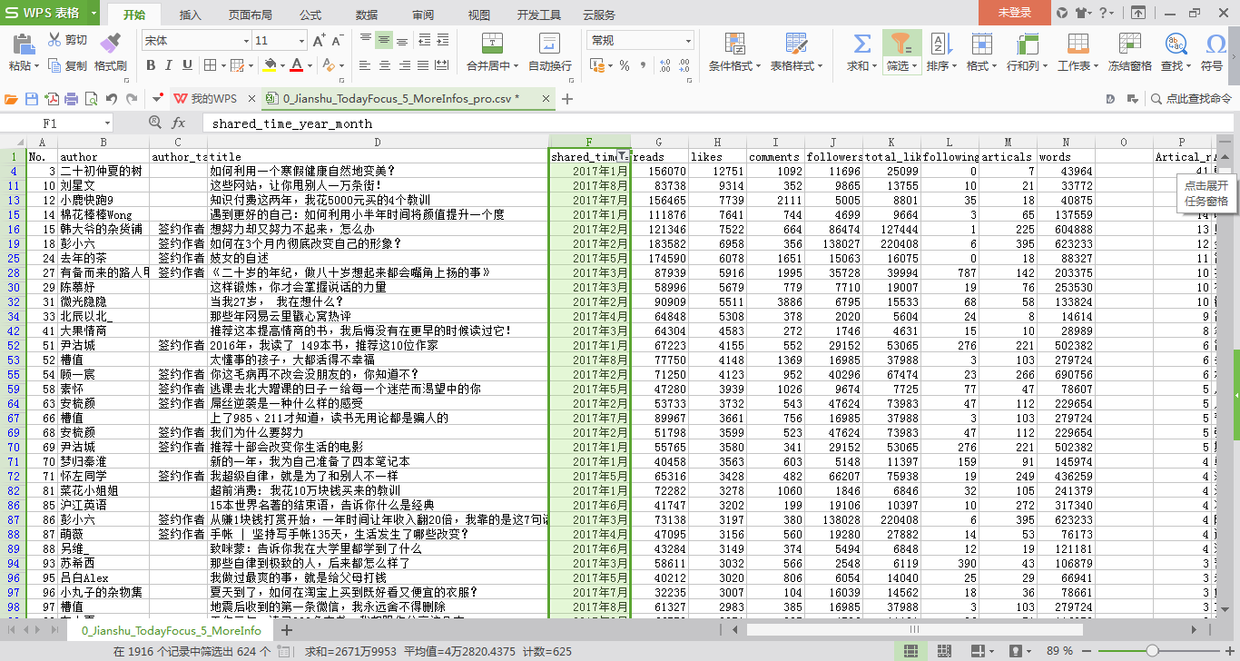 但根据这1916篇文章获赞数降序可知,排名第一的文章,获赞数为:17076;排名最后的为488。由此可见,简书上最热门的文章应该都已经获取到了(后来发现其实并没有,仅是部分,脸疼),基于此后续研究可以继续展开。