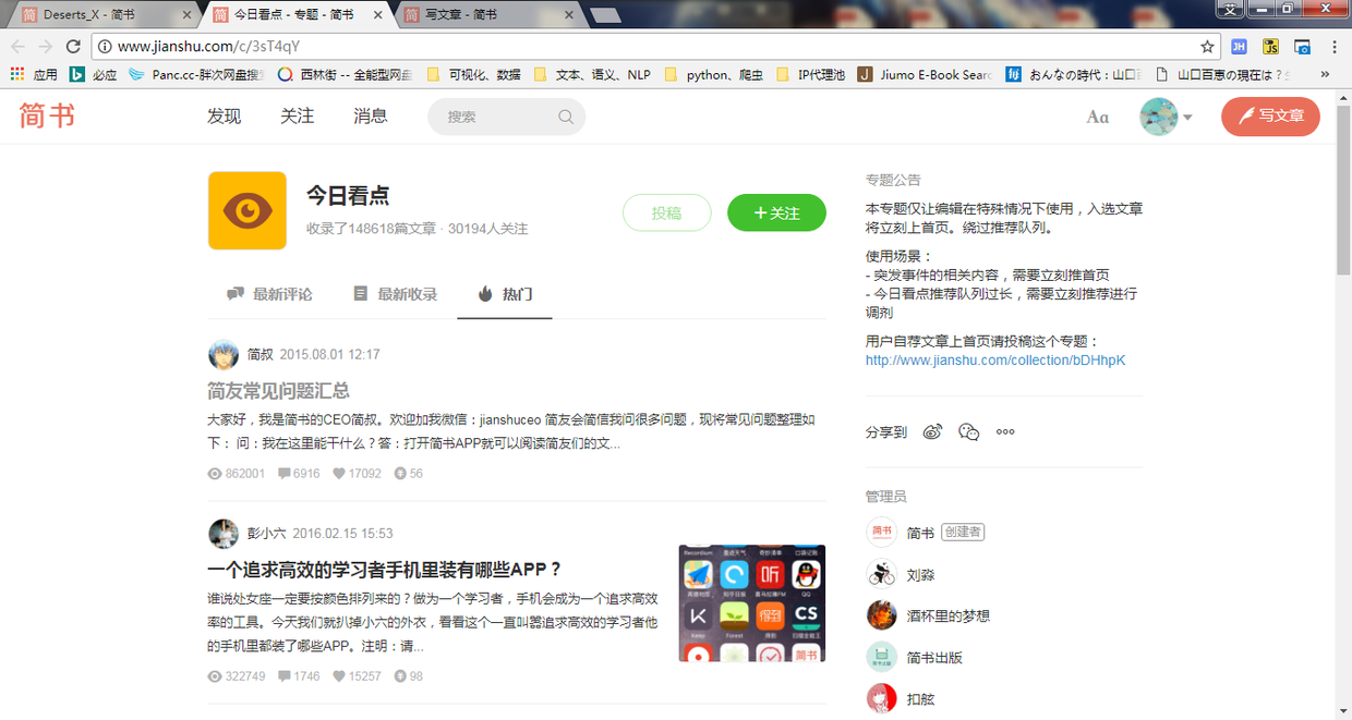 上图可知,目前今日看点收录了148618篇文章, 共有30194人关注。原本想获取所有的文章,但发现爬取到1900+篇时,就再也无法得到更多数据,可能简书方面限制和保护了数据。