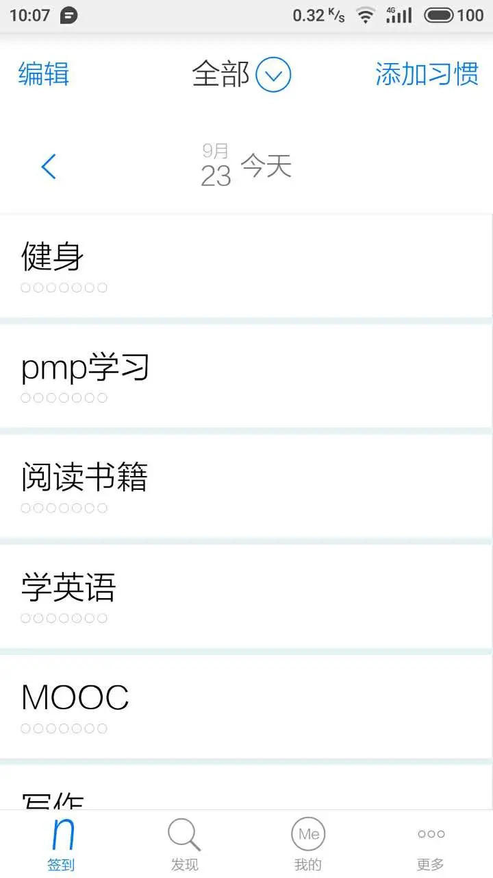 - 框架层:每个APP页面的界面设计,例如「签到」界面,左上角为「编辑」入口,右上角为「添加习惯」入口,界面绝大部分为习惯文字列表展示,可以完成习惯。