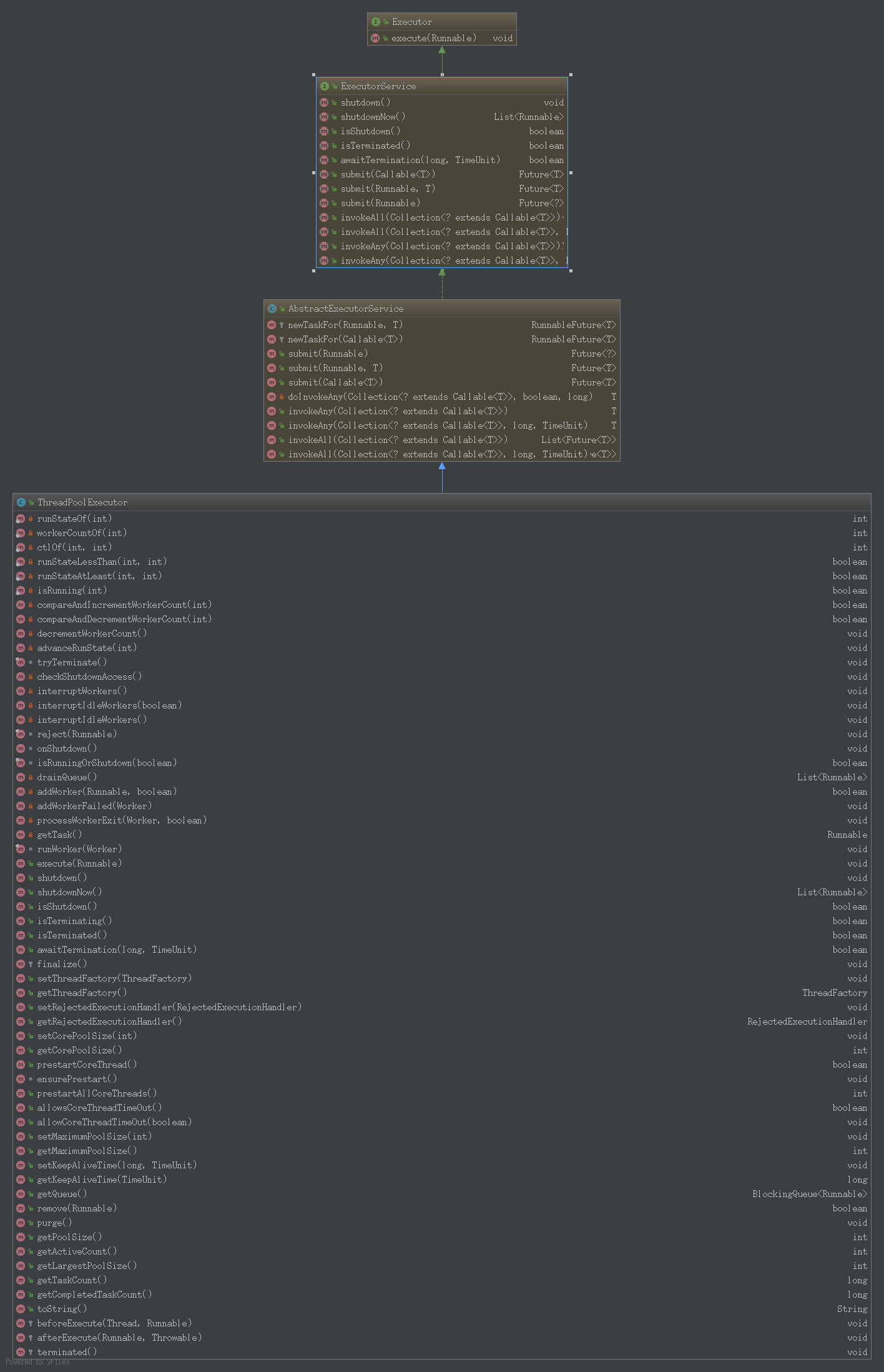 它们都在java.util.concurrent包中,是JDK并发包的核心类,其中,Executor是一个interface,只有一个execute方法;Executors扮演着线程工厂的角色;ThreadPoolExecutor表示一个线程池,用来管理我们的线程。