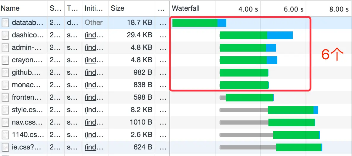 因为在http 1.1时代,由于需要建立多个TCP连接,服务器需要更多的线程来处理请求,同样地,浏览器也需要,所以浏览器会限制同一个域的同时请求数,Chrome是限制6个,总连接数是17个,其它浏览器的个数有所浮动,但差不多,读者可以这个网站测试自己所用的浏览器的限制情况。可以实际对比一下,http 1.1会让资源排队加载,如下图所示: