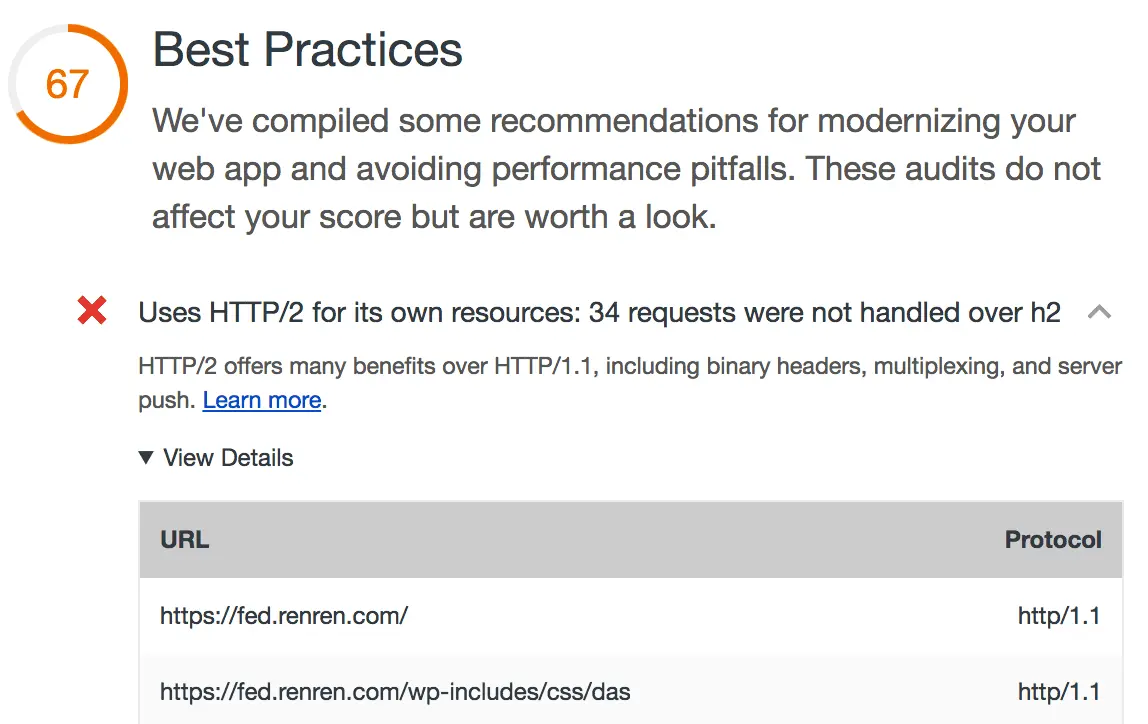 为什么要升级到http/2呢?我们用Chrome的控制台进行网站评测的时候,非http/2的网站会给一个建议: