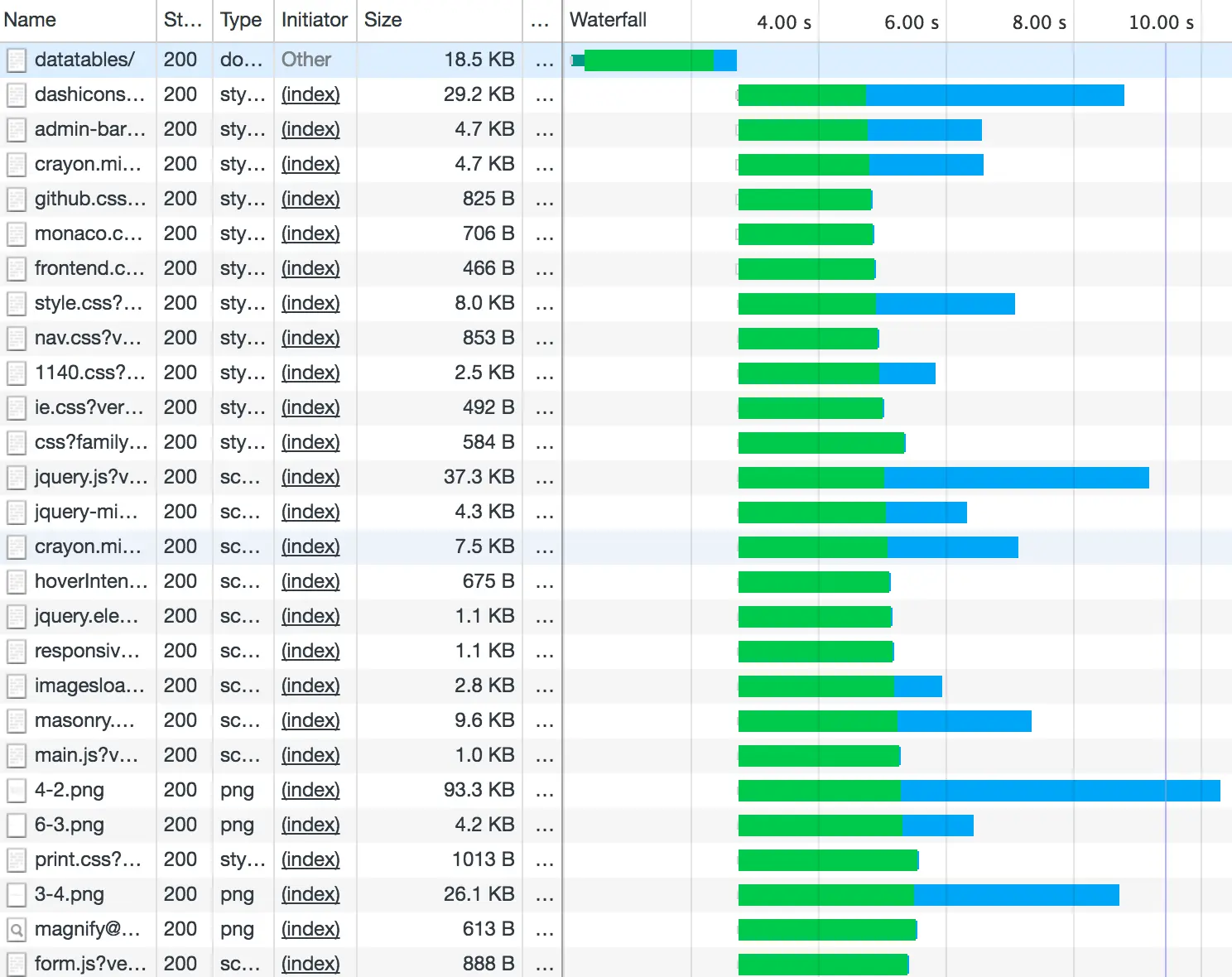 你会发现这些资源都是同时加载的,后面加载的资源不需要进行排队。也就是说理论上带宽有多大,就能传多快。实际的效果在笔者的博客网站上,用了一个页面重复了5次,比较平均值,load时间只快了4%,在我这个例子并不是很明显,但并不能代表HTTP 2没什么用,如果nginx和业务服务的连接也是http/2应该会更好。