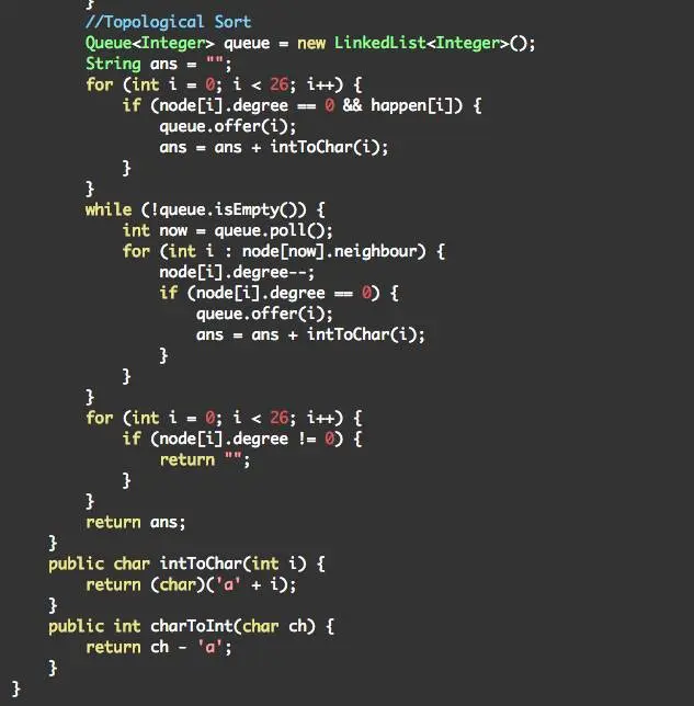 拓扑排序可以在O(m)时间内用宽度优先搜索实现,m为边数。具体做法为:计算每个顶点的入度,将入度为0的点加入队列,并把该点从图中删去(同时减少从该点出发到其他点的入度),若因此导致其他点入度为0,将那些入度变为0的点也加入队列;直到队列无法加入更多点。此时,若全部点都在队列中,拓扑排序成功,该队列顺序即为字母顺序。否则没有合法的字母顺序序列,输出空串。算法整体时间复杂度为O(n*length),n为单词个数,length为单词平均长度。