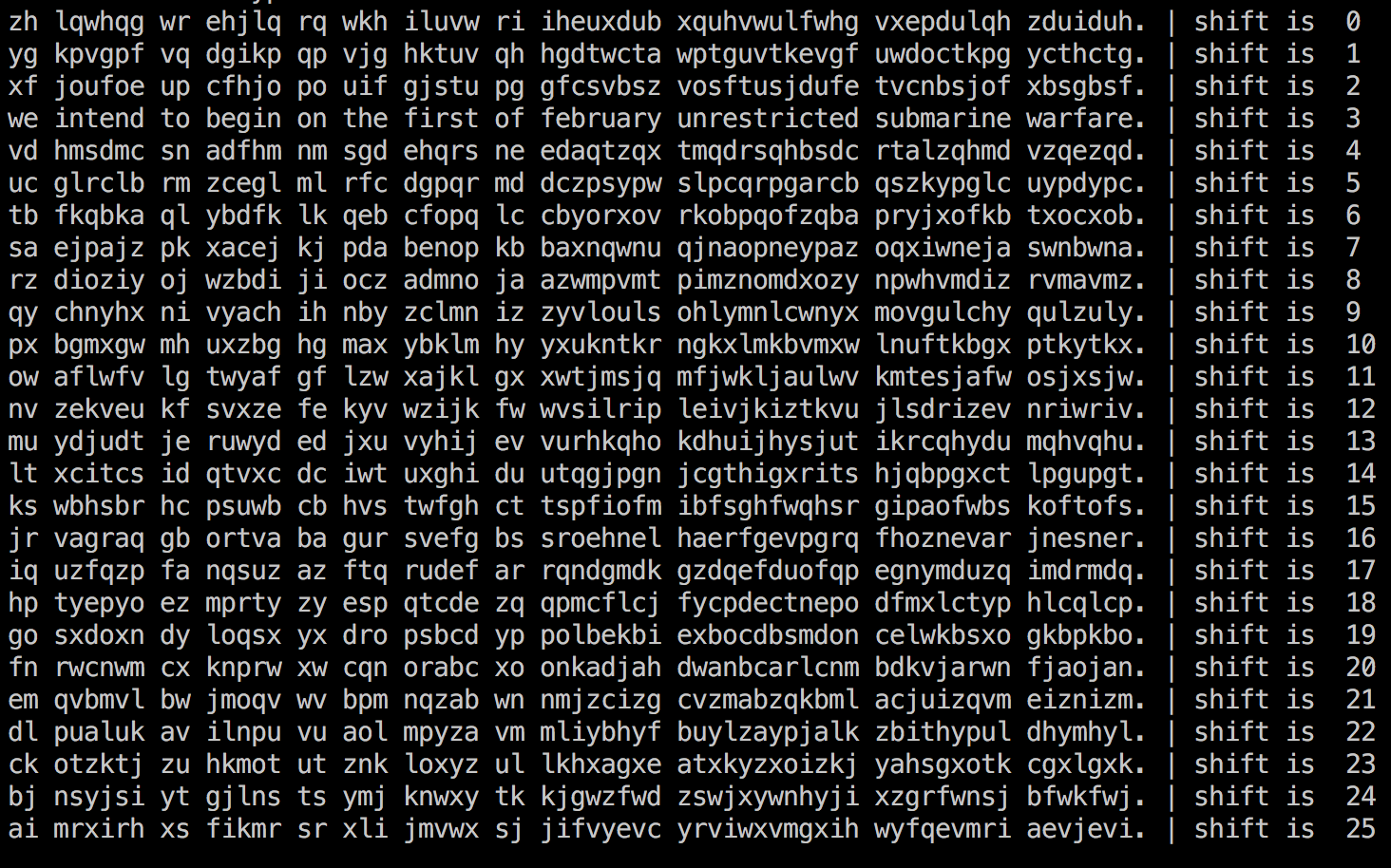 如果当时你截获到这样一份电报你会怎么想?在短暂的一面懵逼之后,显然要想办法破解出正常的意思才行。破解的思路其实也非常简单:因为加密时可以人为设定 shift 值,那么我们就从 0-25 循环来一遍看看哪个是有意义的就行了: