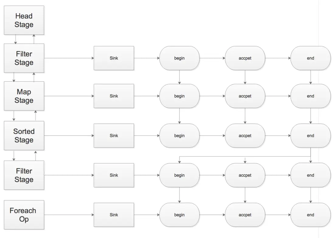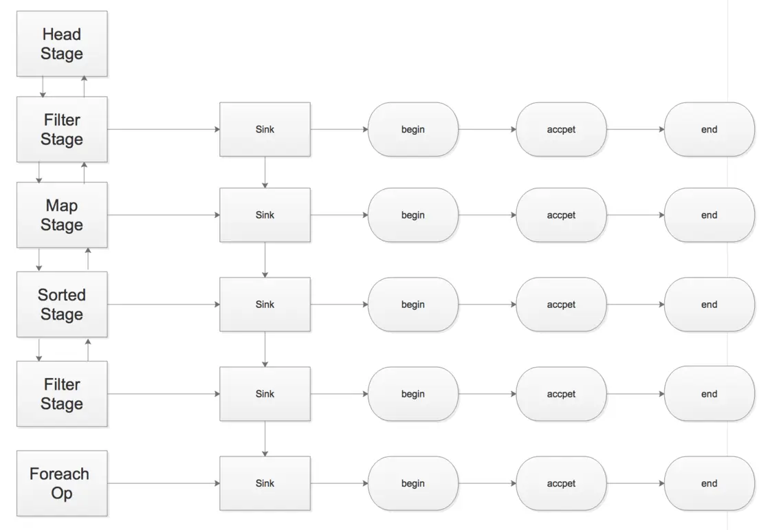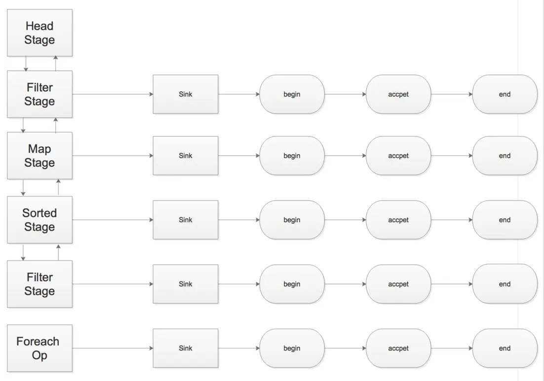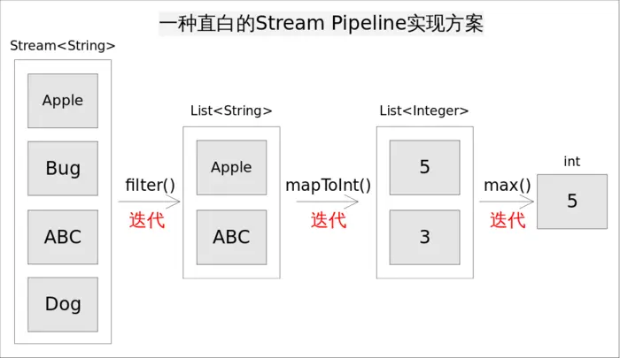 Stream做到的是对于多次调用合并到一次迭代中处理完所有的调用方式.换句话说就是解决了上述的两个缺点.大概思路是记录下每一步的操作,然后终端操作时对其迭代依次执行每一步的操作,最后再一次循环中处理.