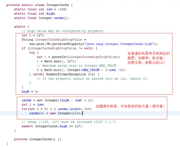 这是一个内部静态类,该类只能在Integer这个类的内部访问,这个类在初始化的时候,会去加载JVM的配置,如果有值,就用配置的值初始化缓存数组,否则就缓存-128到127之间的值。