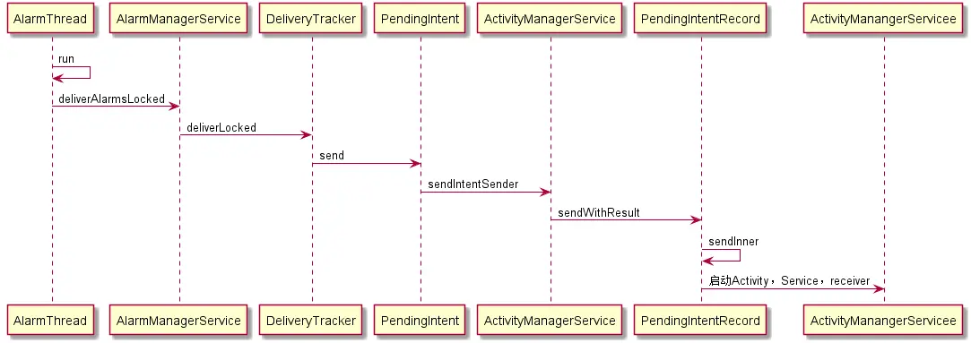 AlarmManagerService中有一个AlarmThread,该线程在该Service启动后就一直执行。该线程不停的遍历Batch列表,查看是否有Alarm需要执行(该流程类似于Loop与MessageQueue)。