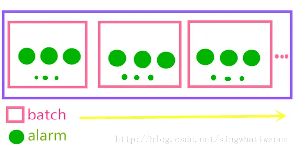 时间升序排列,所有的Alarm唤醒顺序按照batch的排列顺序触发,同一个batch的不同alarm是同时发生的。示意图如下
