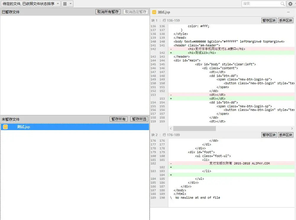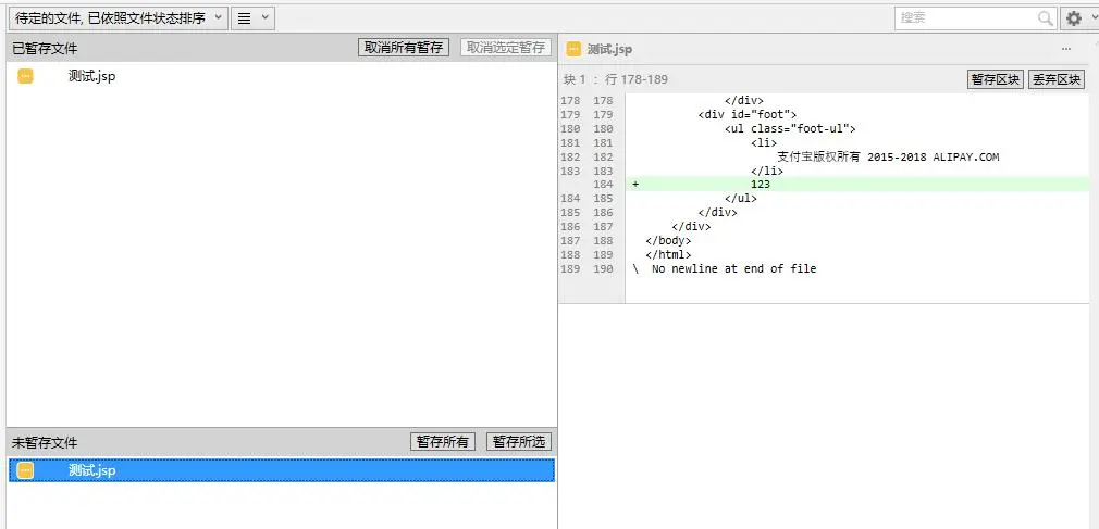 暂存和丢弃类似,是将代码片段暂存到本地暂存区 以备提交,提交时所提交的代码就是暂存区的代码。
