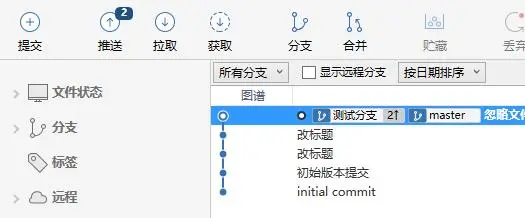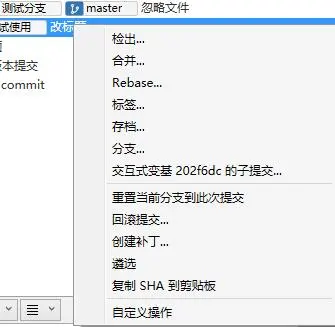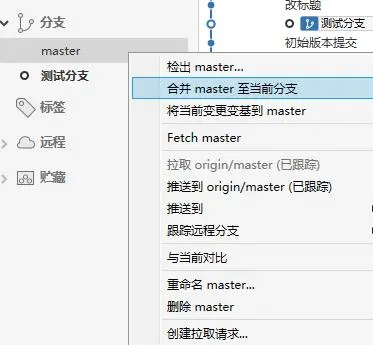 由图中可以看出,我们的测试分支代码落后master分支2个节点,我们可以在master分支上右键选择合并到当前分支