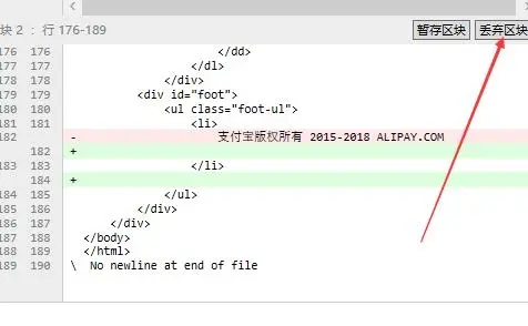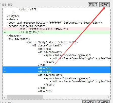 <dt></dt>,随后又增加了一行<dt></dt>,造成这种现象一般是代码格式化或者不小心增加了某些空格等不可见字符导致,我们可以直接选中那2行,然后点击上方的丢弃行。需要注意的是,丢弃不等于删除,丢弃所丢的东西是那一行的变更,比如是+号,那么丢掉代表不增加这一行,减号-同理丢的是不删除这一行,也就是恢复这一行。