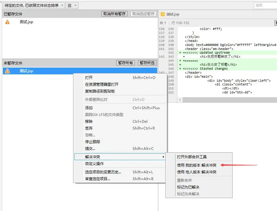 $ git stash这个时候,我们需要指定一个版本,比如是别人的版本为准,还是我的版本,随后右键文件选择 解决冲突使用我的版本(左侧栏选择文件状态-》工作副本)