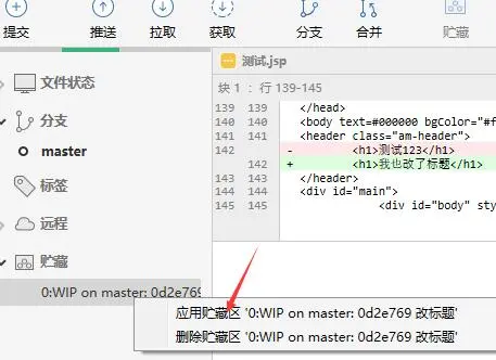 我们可以先将我们代码贮藏起来(菜单栏),然后再拉取代码,接着应用贮藏,应用后冲突的文件会显示出来
