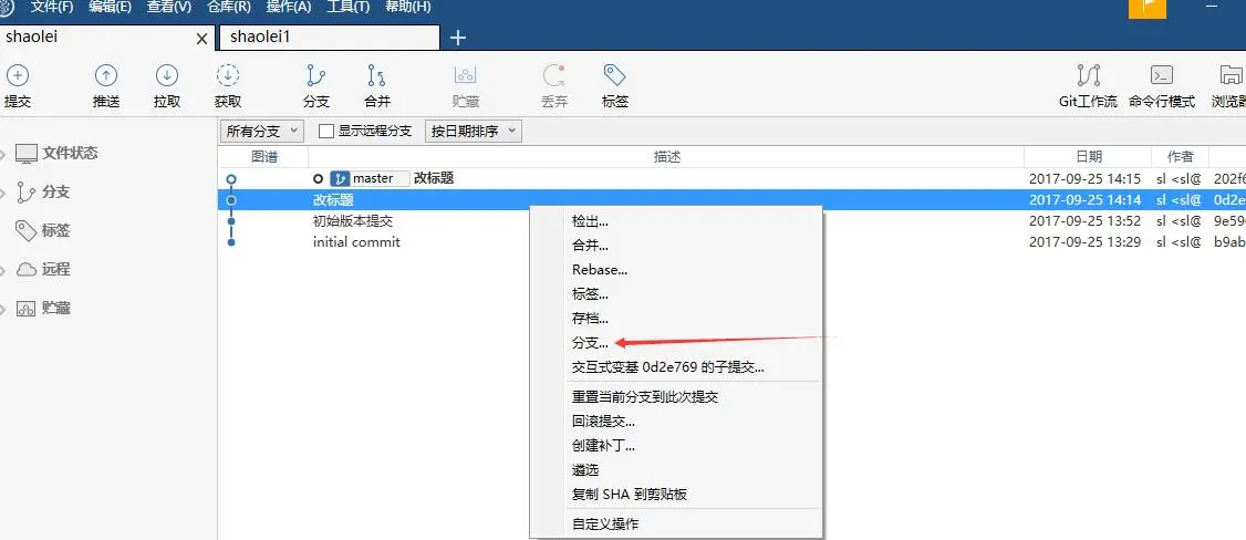 在项目中,我们可能分为开发分支、集成分支、生成环境分支等,这时我们只需要在某个节点上右键选择分支即可