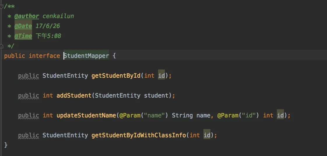 下图就是一个针对Student表操作的接口文件StudentMapper,在StudentMapper中,我们可以若干方法,这个方法背后就是代表着要执行的Sql的意义。