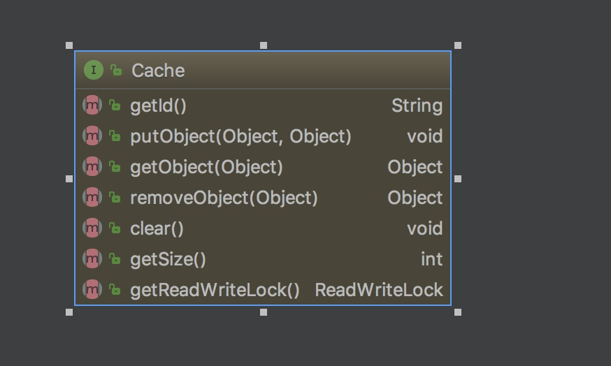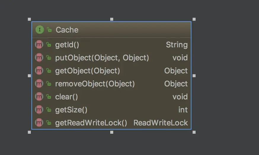 BaseExecutor: BaseExecutor是一个实现了Executor接口的抽象类,定义若干抽象方法,在执行的时候,把具体的操作委托给子类进行执行。在一级缓存的介绍中,我们提到对Local Cache的查询和写入是在Executor内部完成的。在阅读BaseExecutor的代码后,我们也发现Local Cache就是它内部的一个成员变量,如下代码所示。protected abstract int doUpdate(MappedStatement ms, Object parameter) throws SQLException; protected abstract List<BatchResult> doFlushStatements(boolean isRollback) throws SQLException; protected abstract <E> List<E> doQuery(MappedStatement ms, Object parameter, RowBounds rowBounds, ResultHandler resultHandler, BoundSql boundSql) throws SQLException; protected abstract <E> Cursor<E> doQueryCursor(MappedStatement ms, Object parameter, RowBounds rowBounds, BoundSql boundSql) throws SQLException;Cache: Mybatis中的Cache接口,提供了和缓存相关的最基本的操作,有若干个实现类,使用装饰器模式互相组装,提供丰富的操控缓存的能力。public abstract class BaseExecutor implements Executor { protected ConcurrentLinkedQueue<DeferredLoad> deferredLoads; protected PerpetualCache localCache;