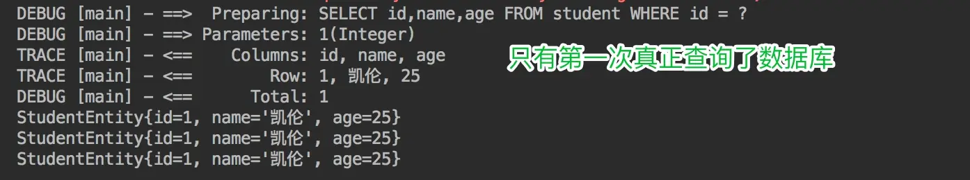 开启一级缓存,范围为会话级别,调用三次getStudentById,代码如下所示: